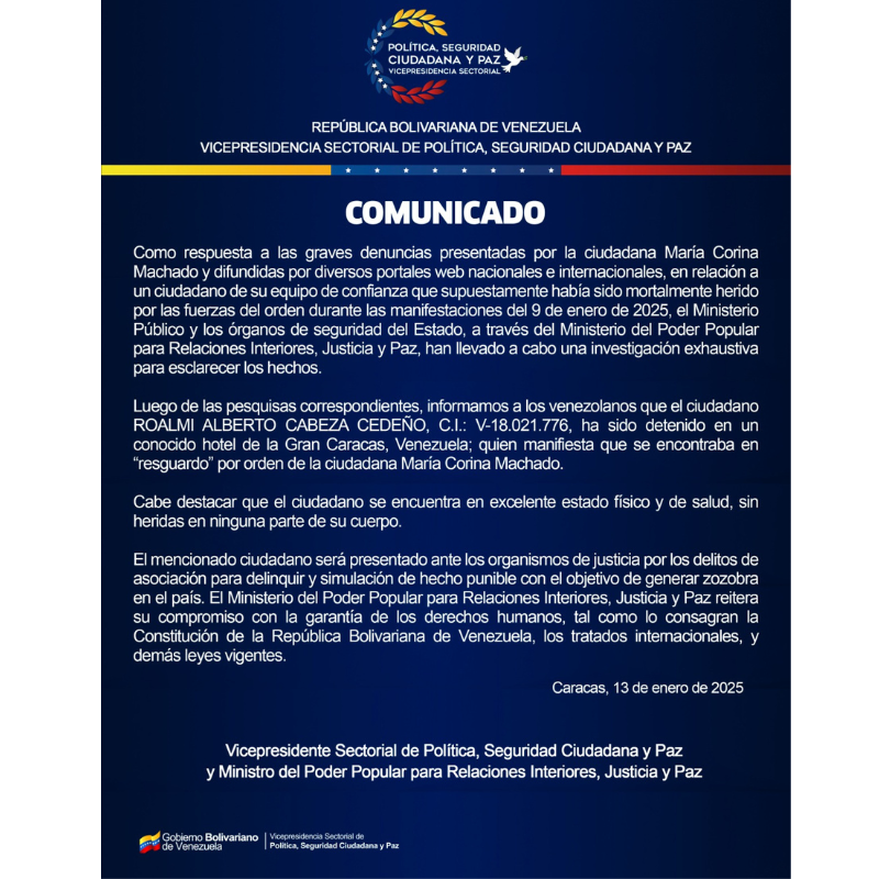 Funcionarios de la Policía Nacional Bolivariana detuvieron a Roalmi Alberto Cabeza Cedeño, quien, según la dirigente de la oposición María Corina Machado, habría sido presuntamente «herido y desaparecido» por los cuerpos de seguridad del Estado el pasado jueves 9 de enero.